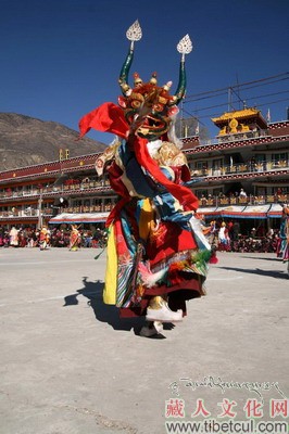 阳光照耀着寺院的金顶,嘎登彭德林寺里法号轰鸣,信徒从四方聚集而来,众护法神之舞是跳神大法会的重头戏。护法神一共有24名,24名护法神中,排在最前的是具誓法王当金确杰。他在藏传佛教中拥有很高的地位,属于出世间的护法神,是文殊菩萨的化身。在格鲁教中特别受重视。据说他居于南方七层地下,掌管一切生命轮回之狱主,为护持业果教法及下士道之护法。所以又被译为“阎罗护法”。