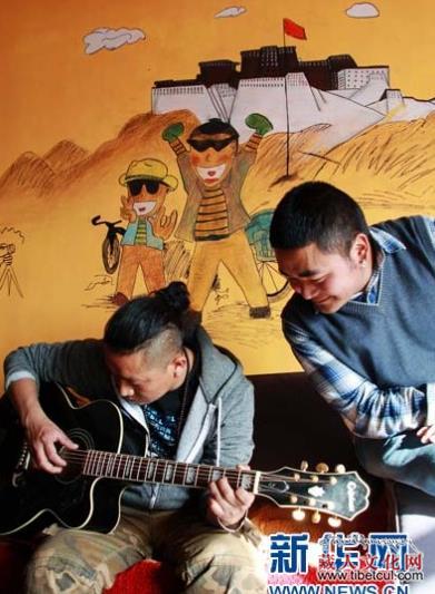 一套普通的民房被他们装点得充满音乐情调,墙上绘着藏传佛教中妙音天女“央金玛”的图画,还重现了藏族古老的记谱方式。录音间虽然不大,但调音台、电容话筒,贝斯、架子鼓、键盘等各种配乐设备一应俱全。