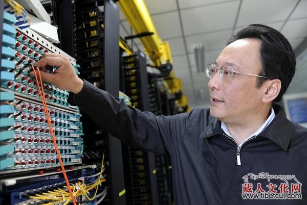 9月7日,西藏大学计算机专业教授尼玛扎西在机房检查网络通信设备。 摄影:觉果