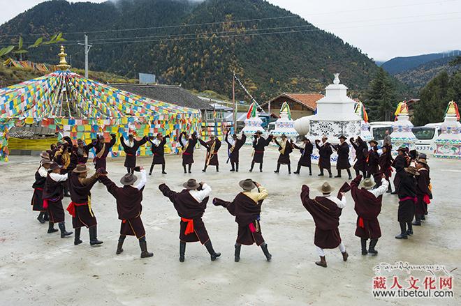 我的任务是拍照,但镜头追逐最多的还是邓培老人,我忍不住为他敏捷矫健的身影赞叹。在苍凉古朴的曲调中,在舒展豪迈的舞姿中,时间静静地流逝着。我看见落日的余晖从对面的山巅滑过,消失。村寨的上空飘着薄雾似的袅袅轻烟。听着耳边悠悠古调,魂归远古的安详紧紧地包裹着我的心。旋律一变再变,动作也跟着不断变化,最后,他们唱着跳着曲折回环地转起了“如意宝珠圈”,当转完后又成了一个完整的圆圈。