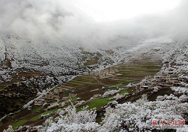 藏寨四周都铺满了白雪,村落的寨楼依山而建、错落有致,其轮廓清晰明了。先前笼罩藏寨的雾轻柔而美丽,时而似若一群身着轻纱的仙女,自下而上,在藏寨的头顶飘逸而过,时而又像一块徐徐落下的帷幕,将整个村落遮挡得严严实实,让没有被积雪完全覆盖的寨楼及其麦苗青青的地块朦朦胧胧、若隐若现,而田边地角的围栏、土坎及零星的几丛灌木,却一应堆积起毛绒绒的雪,宛若洁白的花朵尽情绽放枝头,如同一幅别致的“花海”景象……