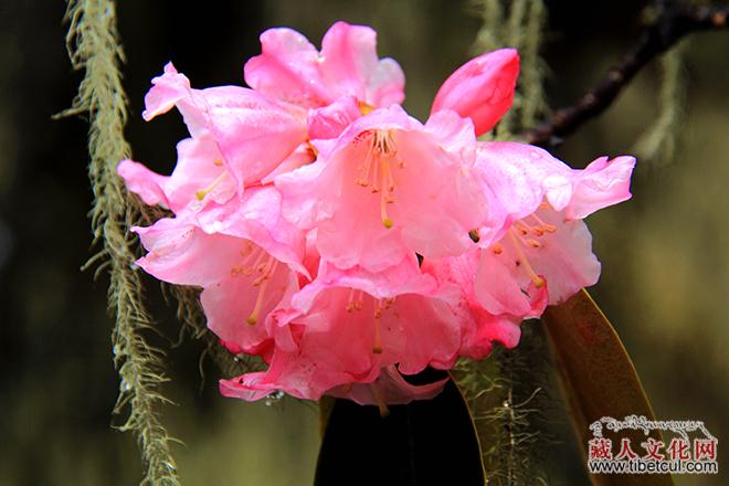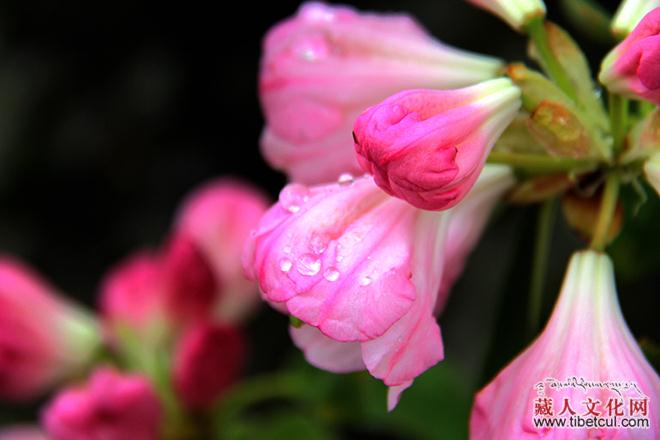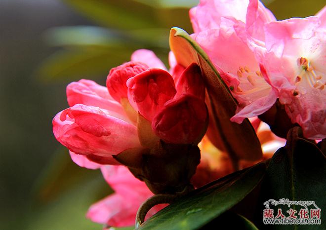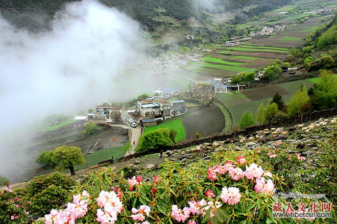 高原山区的气候总是变幻无常,一会儿晴空万里,一会儿大雨倾盆。幸好老天有眼,天刚蒙蒙亮,细雨如丝般罩着我们前行,当我们走进那一片羊角花海时,骤然停息,似醉非醉地粘在羊角花瓣儿和枝叶上,如玉般温润,衬托出花丛的美丽。眺望藏寨,缕缕炊烟从厨房的烟窗袅袅升起,村寨里早已你来我往,人声喧哗。村头巷尾、家家户户的房屋上都拉起了祈福的经幡,插上了五星红旗,无不洋溢着节日祥和喜庆的节日气氛。一条两百来米长的村道上和村委活动室的场院里,已经停满了各式各样的车辆,而花丛中已经挤满了赏花的人。董马藏寨,又一次为我们呈现了一幅幅精美的画面。
