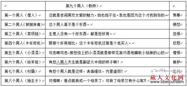 小说《第九个男人》[1]中女主人公雍措和九个不同的男人有过不同的情感纠葛,她和他们的感情故事几乎我们每个人都能讲出一两个,或是调侃的、或是惋惜的、或是羡慕的……从故事和情节而言,它是民间普遍的感情生活形态;小说的特殊性在于,女主人公雍措会把自己和其他八个男人之间的情爱故事讲给她的第九个男人听,第九个男人每听完一个故事就会做一句评价(如图所示):