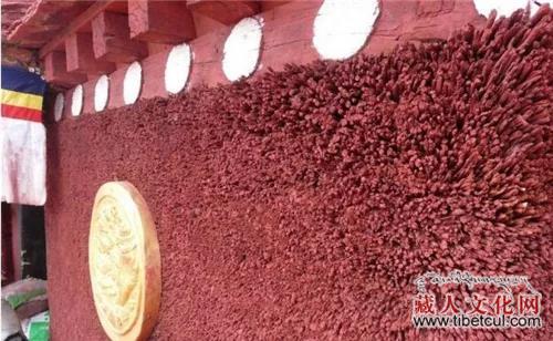 西藏的寺庙的外墙顶上总有一条赤红色的,其实除了寺庙外,一些贵族的建筑,宫殿官邸中也会用到,学名‘边玛墙’,取名于制作这种墙体的材料——‘边玛草’。它一般位于墙体的外侧,用木钉固定,刷深赤红色。