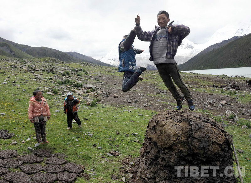 这是藏北比如县儿童在自家牛粪垛上蹦跳玩耍(唐召明2014年7月10日摄)